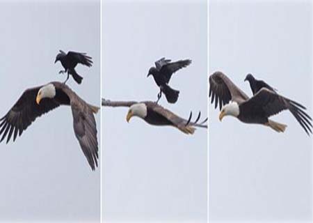Um corvo pra lá de folgado foi fotografado no ar pegando carona nas costas de uma águia americana.