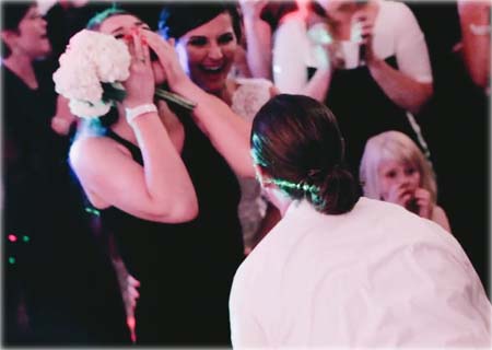 Aí Brett entrou na cena e no meio de todos entregou as alianças e se ajoelhou para pedir a namorada em casamento.