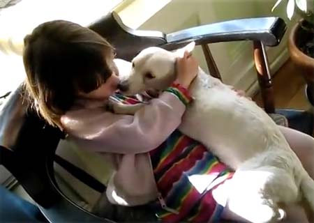 Na cadeira, a cachorra beija e abraça tanto a menina, filha dos novos donos… que emociona.