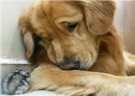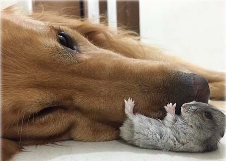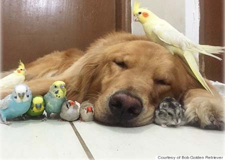 Ele aparece em fotos todo amável, ao lado de seus amigos nada convencionais: um hamster e vários passarinhos.