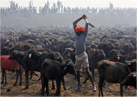 2,5 milhões de adoradores sacrificaram 200.000 cabras e búfalos durante a mais recente edição do festival Gadhimai, em novembro passado, na aldeia de Bariyapur perto da fronteira indiana.