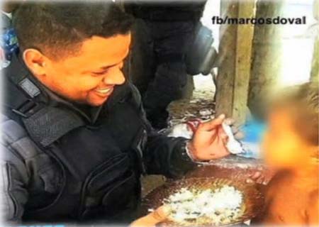 A foto de um policial dividindo um prato de comida com uma criança da favela está conquistando as redes sociais.
