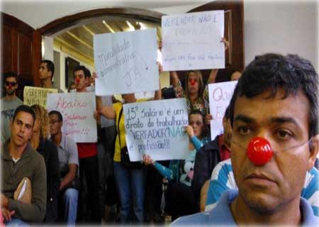 O movimento pacífico foi com cartazes, palavras de ordem e nariz de palhaço.