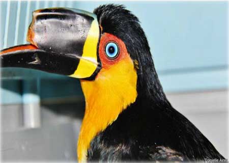 Chegou ao centro de triagem do Ibama em uma caixa de papelão com outro tucano, bem maior do que ela. Estava magra, desnutrida e já sem parte do bico.