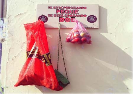 que tem sido mais legal é que os comerciantes e os próprios moradores tem enviado email solicitando a placa-cabide. Além de roupas, sapatos e edredons, tem gente pendurando até comida nas placas”. (foto abaixo)