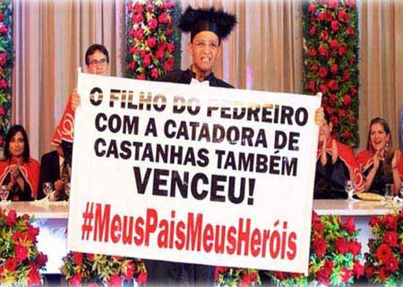O jovem subiu no tablado da área de entrega do diploma carregando um banner dizendo: “O filho do pedreiro com a catadora de castanhas também venceu”.