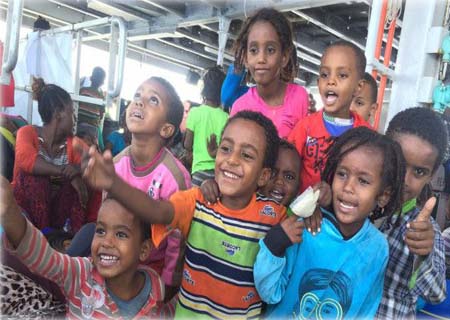 Regina conta com ajuda de uma equipe com técnicos e médicos. Enquanto esperam para desembarcar, após os primeiros socorros, ela e os voluntários do MSF brincam com as crianças a bordo.