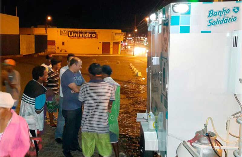 Há 1 mês ele montou o “banho solidário” itinerante. É um carro com ducha, shampoo, sabonete e tolha para levar higiene melhorar um pouco o dia de pessoas sem-teto.