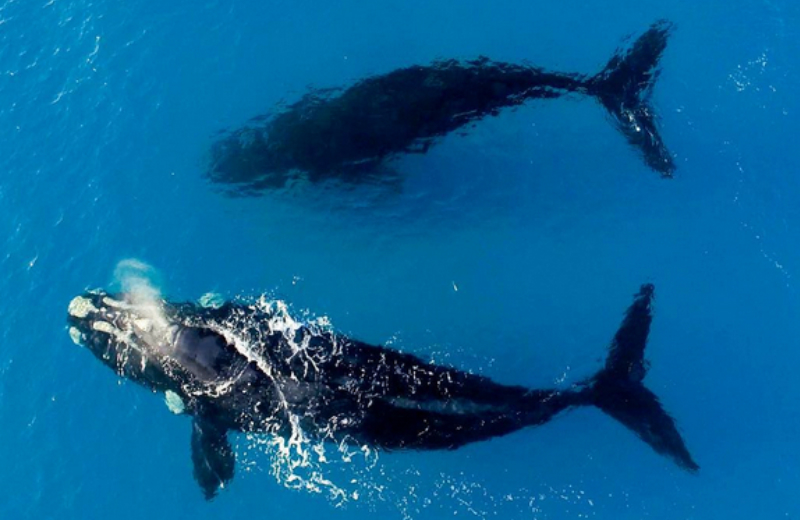 Logo abaixo do surfista, é possível admirar duas baleias gigantes nadando tranquilamente, sem demonstrar qualquer esboço de preocupação com a proximidade da prancha.