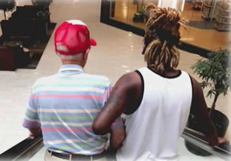 Jovem segura idoso para descer escada rolante e toca corações