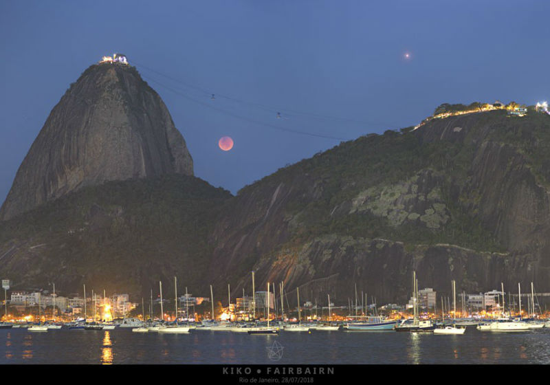 A foto captou a Lua de Sangue da última sexta-feira (27) e Marte sobre as curvas do Pão de Açúcar, um dos cartões-postais do Rio de Janeiro.