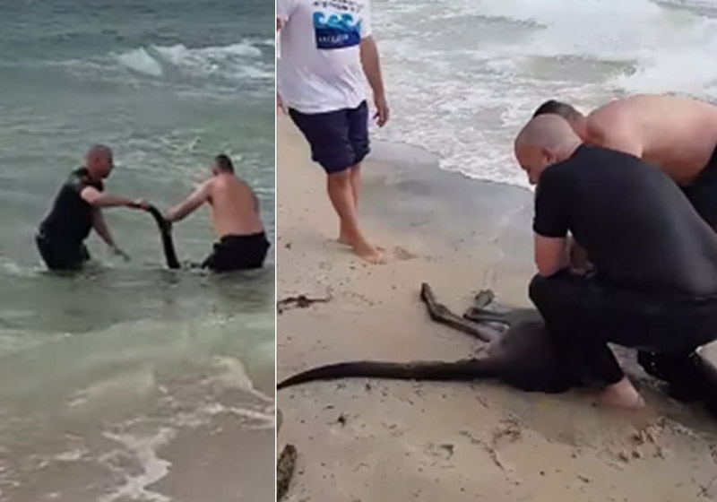 Os dois pularam no mar, puxaram o animal inconsciente para terra firme e fizeram compressões torácicas para reanimá-lo.