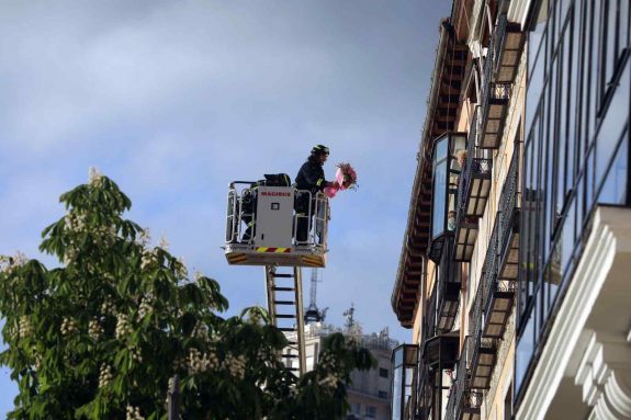 Respeitando o isolamento social, o neto dela Julián García, que é bombeiro, levou um buquê de flores para a vovó em uma escada magirus e chegou até a janela dela, no terceiro andar do prédio, para mostrar o presente.