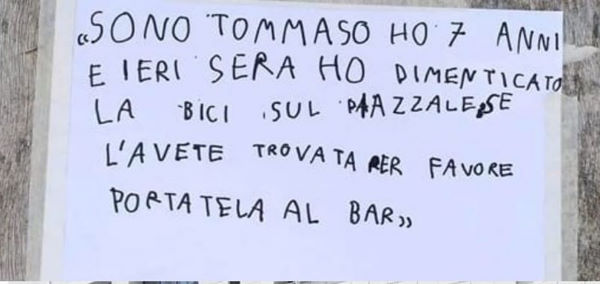 “Sou Tommaso, tenho sete anos e esqueci minha bicicleta na praça ontem à noite. Se você a encontrou, leve-a ao bar.”