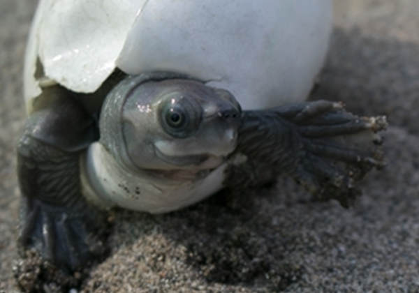 Os pesquisadores coletam os ovos postos pelas fêmeas selvagens restantes em fevereiro e março de cada ano e incubam os ovos em uma remota vila ribeirinha.