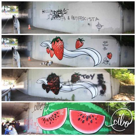 Uma parede coberta com suástica, por exemplo virou um bolo colorido. Outra com vários insultos foi transformada em morangos e melancias.