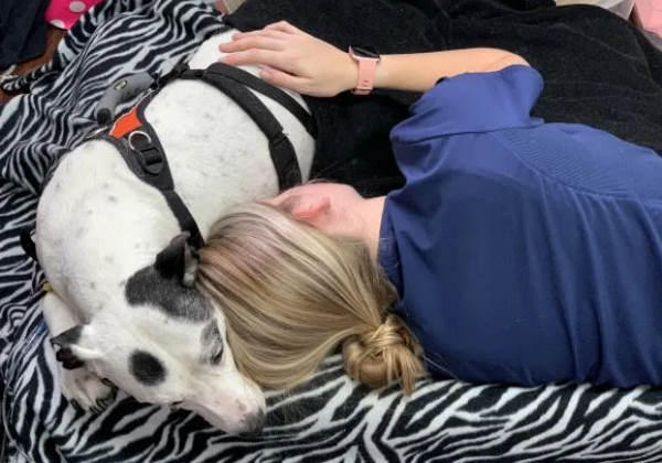 Técnica veterinária dorme com pitbull com câncer para confortá-lo