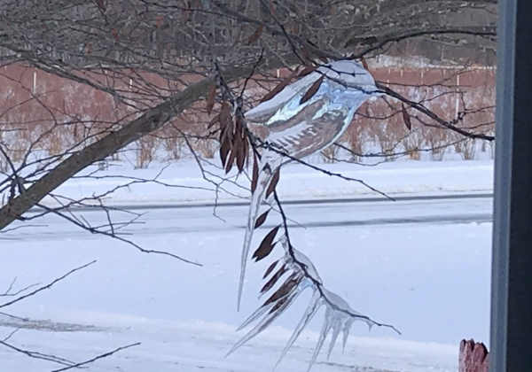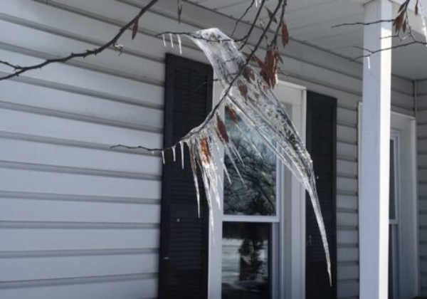 A escultura de gelo foi formada pelo descongelamento provocado por mudanças de temperatura no inverno na América do Norte. Nitidamente tinha um pássaro no galho da árvore.