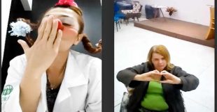 Com a pandemia, o grupo precisou se reinventar. Foi então que surgiu a ideia de criar a “Adriana”, uma palhaça digital que visita os quartos das instituições.