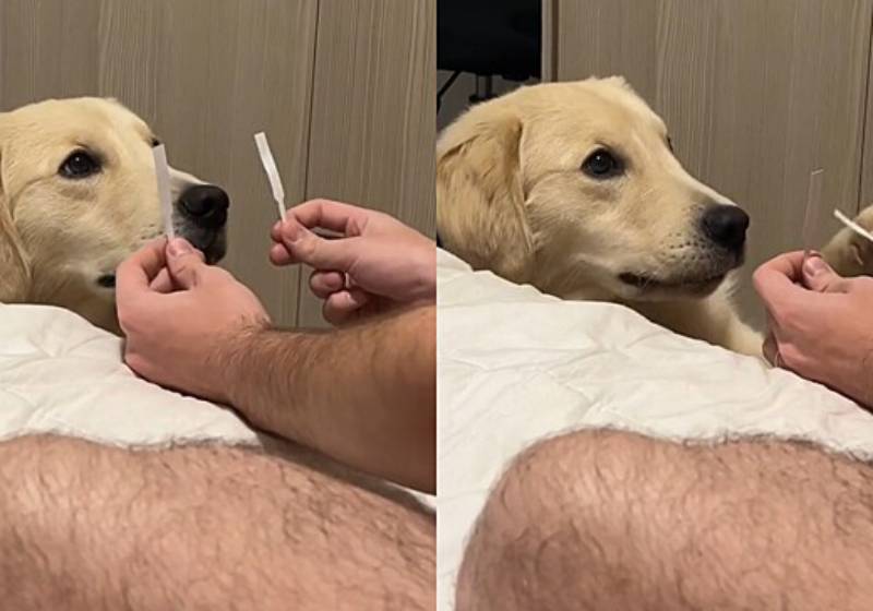 Sentado na cama, o rapaz segura os perfumes em cada uma das mãos e dá para Apolo duas opções. O que acontece é que os dois humanos não imaginavam a reação do cão!