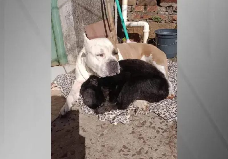 O momento foi registrado pela manicure Rose Silva, tutora do pitbull Zeus. O macaco da raça bugio não é um estranho, ele já aparece há algum tempo no quintal da residência da mulher e ganhou até nome: “Mochila”.
