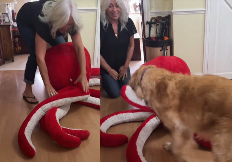 Apaixonado por pelúcia, cão ganha polvo gigante e tem a melhor reação