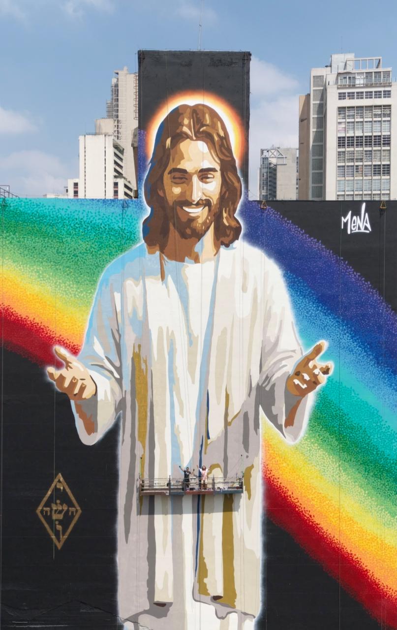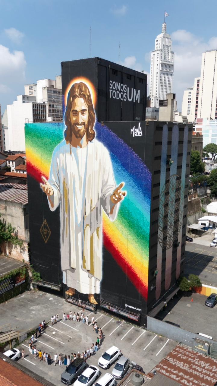 “A obra que eu fiz foi um trabalho voluntário, uma doação pra cidade de São Paulo. Eu recebi essa intuição da espiritualidade pra fazer Jesus nesse momento em que a gente tá vivendo tantos desafios na humanidade, com guerras rolando, uma polaridade grande que está afastando as pessoas uma das outras. E a mensagem mais universal do grande mestre mais poderoso que eu poderia trazer através da arte para ajudar a elevar a vibração da cidade é o mestre Jesus”, disse o artista plástico Mena, autor do mural de arte urbana, em entrevista ao Só Notícia Boa.